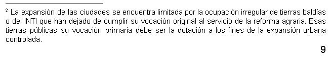 2 La expansión de las ciudades se encuentra limitada por la ocupación irregular de tierras baldías o del INTI que han dejado de cumplir su vocación original al servicio de la reforma agraria. Esas tierras públicas su vocación primaria debe ser la dotación a los fines de la expansión urbana controlada.