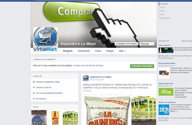 1 julio 2014 - El uso del Facebook o el Twitter puede resultar muy ventajoso a la hora de promocionar productos comerciales y lograr una entrada de dinero extra. Sin embargo, el uso de estas redes sociales puede ser negativo cuando la comercialización de los productos que abiertamente ofrecen, son productos básicos como la leche en polvo, papel higiénico, harina pan, etc., cuya venta se supone que está prohibida.