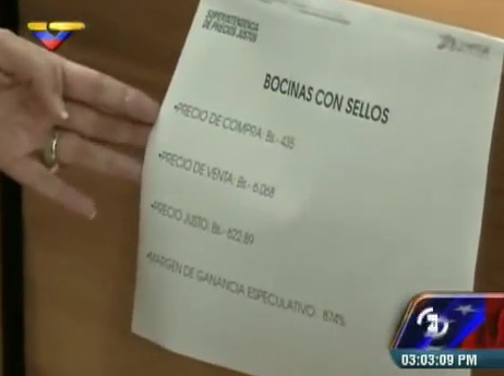 Entre los rubros con sobreprecio están bocinas con sellos, cuyo precio de compra es de 435 bolívares y era ofrecido en 6.068, lo que representa un margen de ganancia especulativa de 874%.