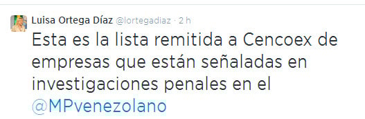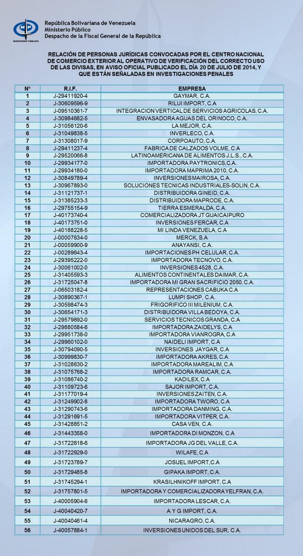 7 agosto 2014 - A través de su cuenta en la red social Twitter, la Fiscal General Luisa Ortega Díaz, publicó este jueves la lista de empresas que están señaladas en investigaciones penales por el Ministerio Público por el uso indebido de divisas.