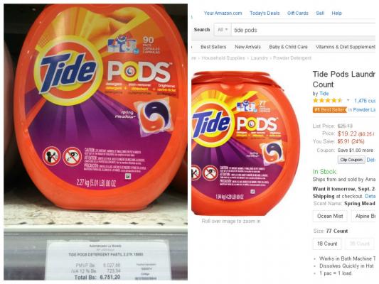 6.751,20 bolívares, no está leyendo mal, en letras para que no quede duda: Seis mil setecientos cincuenta y uno bolívares con veinte céntimos, cuesta un jabón en capsulas para lavandería de la marca Tide Pods. Este mismo producto es comercializado por la tienda online Amazon en 19,22 dólares.