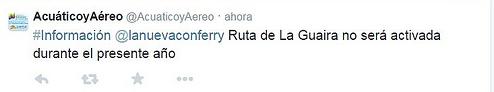 La Guaira, 16 de Diciembre de 2014.- Con una escueta linea en twiter el ministerio de Transporte Acuático y Aéreo anunció, sin mayor ruido, la suspensión del servicio de Conferry en la ruta La Guaira – Margarita.