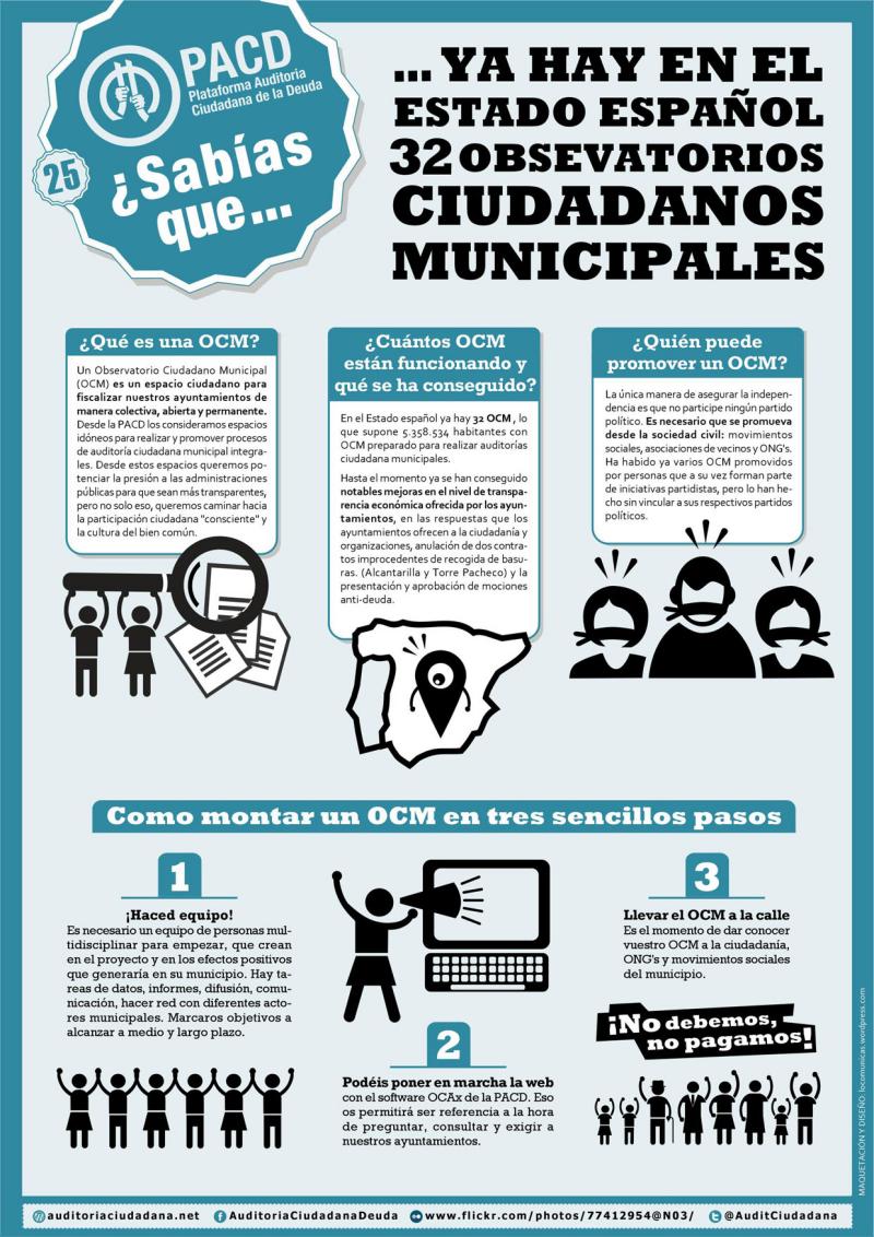 Ya han constituido más de treinta observatorios ciudadanos municipales en el Estado Español como espacios ciudadanos para fiscalizar los ayuntamientos (equivalentes a las alcaldías municipales en Venezuela).