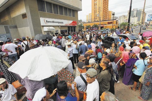 La hilera de sillas de ruedas era abrumadora, donde abuelitos muy mayores clamaban por su pago, entre calor y angustia. Con paraguas y bastones, sufrían también de pie decenas de septuagenarios conglomerados, que con bastante brío exigían su pago.