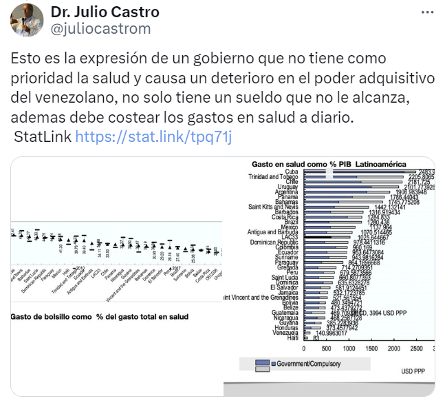 Castro compartió dos gráficos que ilustran esta problemática. El primero, muestra que Venezuela encabeza el gasto de bolsillo en salud con un porcentaje más alto en comparación con otros países de América Latina y el Caribe. El segundo gráfico evidencia la baja inversión en salud del país en términos de PIB, situando a Venezuela en la segunda peor posición de la región.