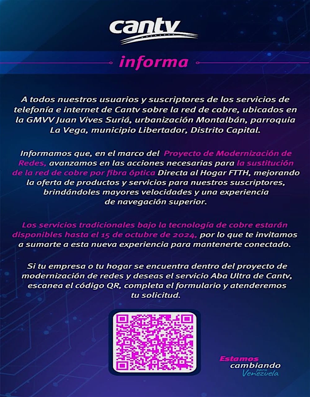 Comunidad denuncia: CANTV avisa corte en red de cobre y líneas de teléfonos‚ además hace cobros indebidos por fibra óptica ABA Ultra