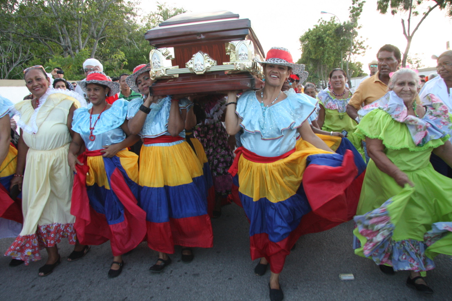 Domelis me trae la última estrofa de la canción Luna Cumanesa. “Desde que se fue, solo me dejó la desolación”. Me asegura que todos sus conocimientos los obtuvo de la gran tía y dueña de la música popular de aquel barrio sucrense, bailadora, comparsera, teatrera, adivinadora que dio a luz cinco hijos varones y dos hembras y me los va nombrando en orden de edad, Carlos Luis, Pablo Emilio, Oscar Enrique, Héctor Alfredo, Marja, Osvaldo y Mirna. Todos están en el velorio de María Magdalena menos Osvaldo que anda muy lejos y Marja, la única fallecida. En este grandioso día Domelis recuerda todos los temas musicales que le dejó María y me tararea otro, La Muerte del Torero que ella saca de su pecho con aquel vozarrón y me cuenta que su abuelo Dionisio Castillo era pescador y ella se lanzaba al mar cuando divisaba el bote, porque junto al producto de la pesca siempre le traía bombones y caricias. Madre de Domelis González, Adelfa Hernández que también era cantante. Aprendió con Magdalena Sánchez, quien la crió y la enseñaba a cantar boleros y merengues . También era comparsera como María Magdalena. Volvemos a hablar de María y me cuenta que ella escogió el traje para amortajarla. Era de color salmón claro la blonda y la falda estaba llena de blancos “faralaos”. Con esa vestidura y la infaltable flor, se le va a enterrar en el Cementerio de Cantarrana. Cuando menos imaginamos ya ha amanecido.