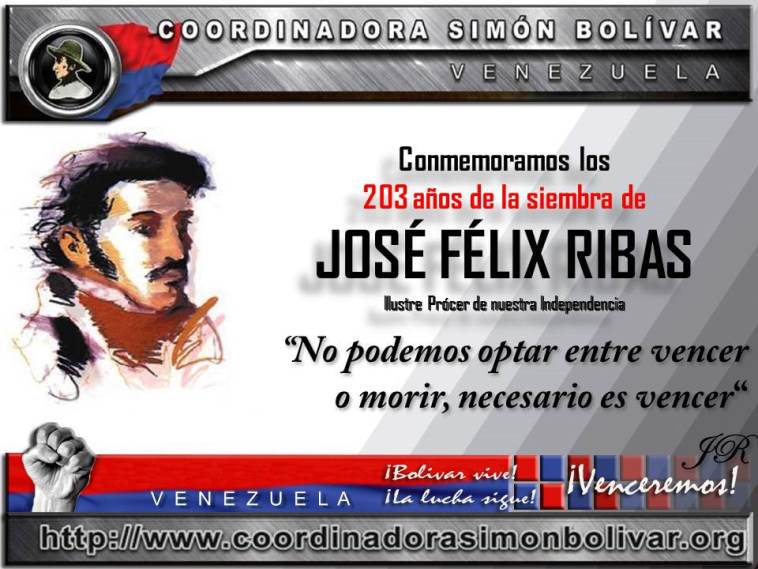 Éste 31 de enero de 2018, se cumple la conmemoración doscientos tres (203) de la siembra de un ilustre prócer independentista, General en Jefe JOSÉ FÉLIX RIBAS, quien naciera en Caracas el 19 de septiembre de 1775, hijo de Marcos Ribas y Bethencourt y Petronila de Herrera.