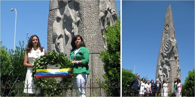 OFRENDA FLORAL ANTE EL MONUMENTO A SIMÓM BOLÍVAR EN A CORUÑA (GALICIA), CON EL ESCULTOR CORUÑÉS MANUEL FERREIRO BADÍA (AL CENTRO, CON BARBA BLANCA) Y EN PRESENCIA DE LA CÓNSUL DE VENEZUELA EN GALICIA, MÓNICA CHÁCÍN, EN EL AÑO 2010