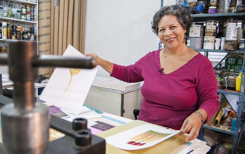 “La primera vez que hice una gráfica fue una impresión que hicimos en el Pedagógico de Caracas. Llegué a mi casa absolutamente enamorada, y dije: tengo que hacer eso pero ¿cómo lo hago? En mi casa había una lavadora que tenía un rodillo, agarré un pedazo de cartón y unas moneditas, le coloqué un papel arriba y lo pasé por el rodillo. Mi mamá me quería matar ese día. Pero cuando vi la impresión, dije: esto es lo que yo quiero hacer. Y desde ese momento no he dejado de hacer gráficas”. Apunta esta experimentada artista venezolana.