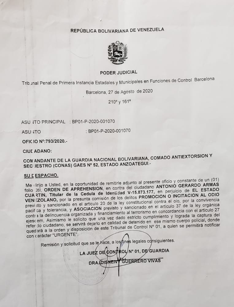 Barcelona, 16 de septiembre de 2020.- En el día de hoy, el Tribunal Penal Primero de Control de Barcelona en el Estado Anzoátegui, dictó una orden de aprehensión contra Antonio Armas Cuartin, por la presunta comisión de los delitos de Promoción o Incitación al Odio y Asociación, previstos y sancionados en leyes venezolanas.