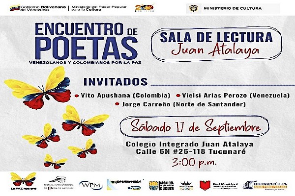 Como una contribución decisiva al restablecimiento definitivo y duradero de las relaciones plenas entre la República de Colombia y la República Bolivariana de Venezuela, se celebrará, los días 17 y 18 de septiembre en las ciudades de Cúcuta –Colombia y San Cristóbal –Venezuela, el Encuentro Binacional de Poetas de Colombia y Venezuela Frontera de Paz.