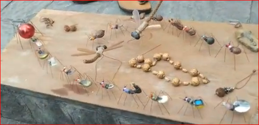 Utiliza elementos naturales y material de desecho que combina en los objetos que elabora.