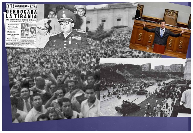 El 23 de enero de 1958 un levantamiento cívico militar derriba a Pérez Jiménez en Venezuela. El mismo día pero en 2019 Juan Guaidó se autoproclama, con la AN opositora como "Presidente Encargado", de manera ilegítima.