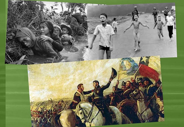 Efemérides del 27 de julio: Día del Recuerdo, de los Inválidos y Mártires de la Guerra de Vietnam: en las fotos pobladores vietnamitas se ocultan de tropas norteamericanas y niños corren quemados por napalm. En la foto inferior el encuentro de Bolívar y San Martín en la Conferencia de Guayaquil. y