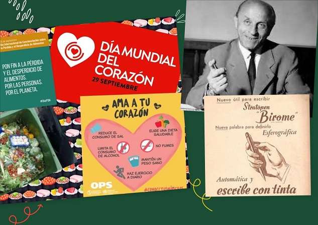 En las efemérides del 29 de septiembre (versión de 2023) destacamos en las imágenes nacimiento del inventor del bolígrafo o "birómi" y una propaganda de la época. Incorporamos gráficas alusivas al Día del Corazón y de No Desperdicio de la Comida