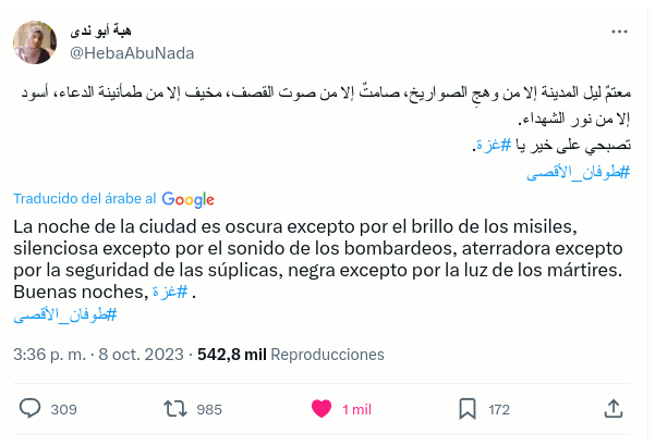Un día antes de ser asesinada, Heba Abu Nada compartió: "Si morimos, sepan que estamos satisfechos y firmes, y digan al mundo, en nuestro nombre, que somos personas justas del lado de la verdad". Salvemos la verdad de Palestina y sus miles de mujeres.