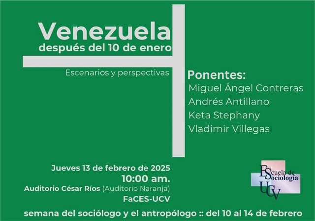 Caracas, 10 de febrero de 2025 - En el marco de la semana del sociólogo y el antropólogo, la escuela de Sociología de la Universidad Central de Venezuela invita a un foro de análisis sobre la situación sociopolítica en Venezuela, luego de la reciente toma de posesión presidencial del 10 de enero de 2025.