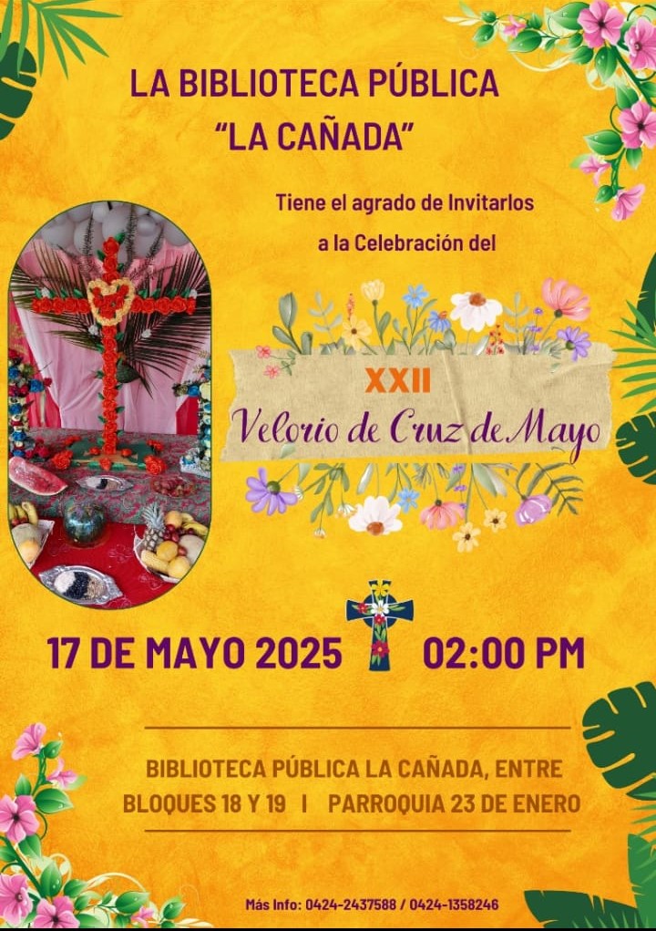El sábado 17 de mayo, la Cruz se realizará en la Biblioteca Pública "La Cañada" de la parroquia 23 de Enero. La cita es a las 2:00 pm