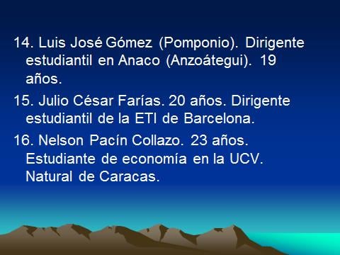 - Luis José Gómez (Pomponio). Dirigente estudiantil en Anaco (Anzoátegui). 19 años.