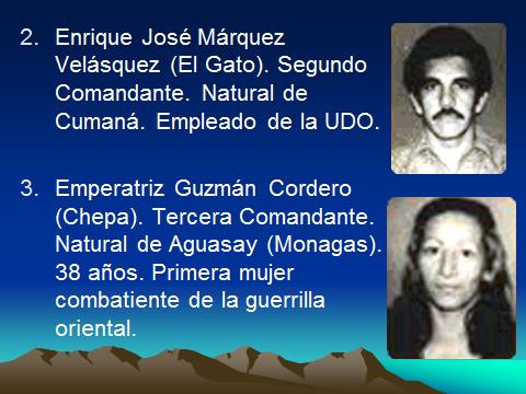 - Enrique José Márquez Velásquez (El Gato). Segundo Comandante. Natural de Cumaná. Empleado de la UDO.