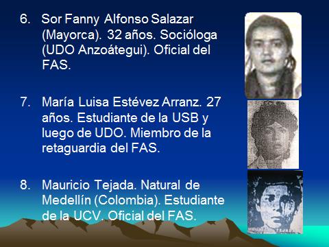 - María Luisa Estévez Arranz. 27 años. Estudiante de la USB y luego de UDO. Miembro de la retaguardia del FAS.