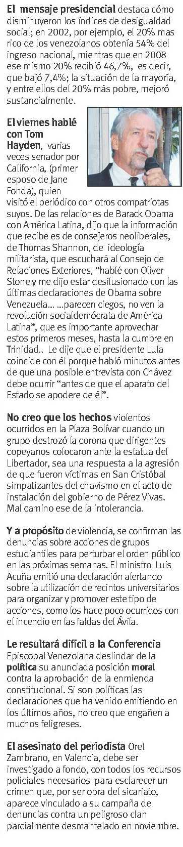 De todos los discursos que le he escuchado en Venezuela al presidente Lula, éste del viernes en Zulia ha sido el mejor y diría que el más completo, que lo mostró como un líder regional. Abordó temas desde cuando en 1982 estuvo a punto de retirarse de la política, luego de su primera derrota como candidato (a la Gobernación de Sao Paulo) y Fidel Castro le hizo ver su error, hasta el proceso de cambios en América Latina iniciado hace diez años con Chávez, con énfasis en Bolivia; las relaciones con EEUU, "Cuba no tiene que hacerle ningún gesto a Estados Unidos, ese bloque perverso no tiene ningún sentido"; la crisis mundial y el rol de nuestros países, los indetenibles avances por la unidad suramericana, y las especiales relaciones con Venezuela: "La unidad no sólo es discurso, debe concretarse con acciones y el pueblo venezolano debe darse cuenta de que esos discursos ya comienzan a transformarse en riquezas, en mejoría de la calidad de vida del pueblo, como ocurre en Brasil. Por eso estamos juntos, trabajando juntos".