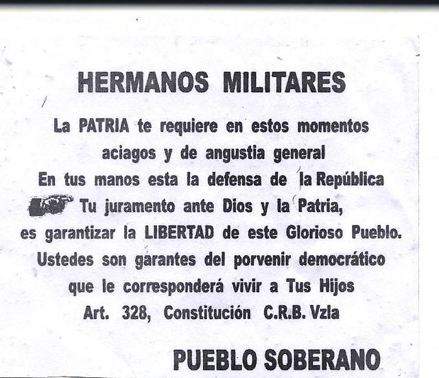 Al frente de la entrada de la compañía anonima nacional de industria militalres CAVIM. se encrontró repleta de panfletos como muestra la imagen que acompaña este reporte. los mismos también fueron regados en otras zonas militares de Maracay.
