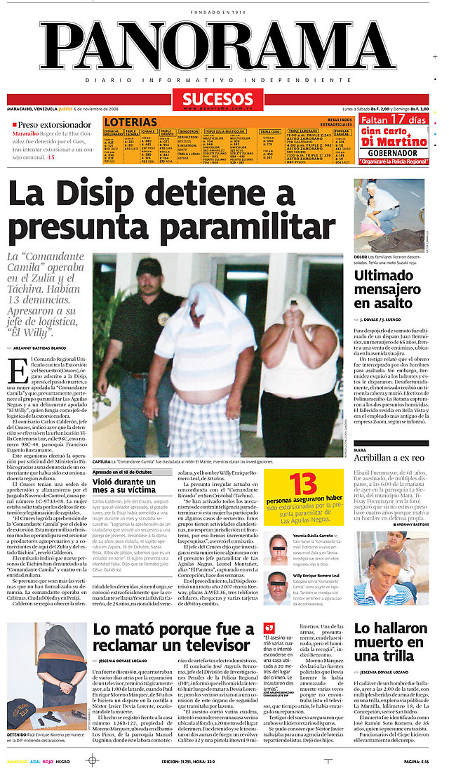 “Camila” operaba, al parecer, en Cabimas, Ciudad Ojeda y Perijá. Las autoridades investigan si esta mujer tiene algún nexo con el presunto jefe paramilitar de las Águilas Negras, llamado “El Pantera”, capturado en una granja en La Concepción, hace dos semanas.