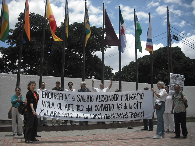 13 de agosto de 2010.- Simultáneamente a la hora en que debía comenzar el juicio en el Tribunal de Trujillo (postergado para el jueves 19 de agosto por retraso de algunos testigos), se reunieron frente al TSJ en Caracas el movimiento popular en solidaridad y apoyo al pueblo Yukpa, para insistir en la libertad inmediata del luchador cacique Sabino Romero Izarra, Olegario Romero y Alexander Fernández, a fin de que sean juzgados por la justicia indígena.