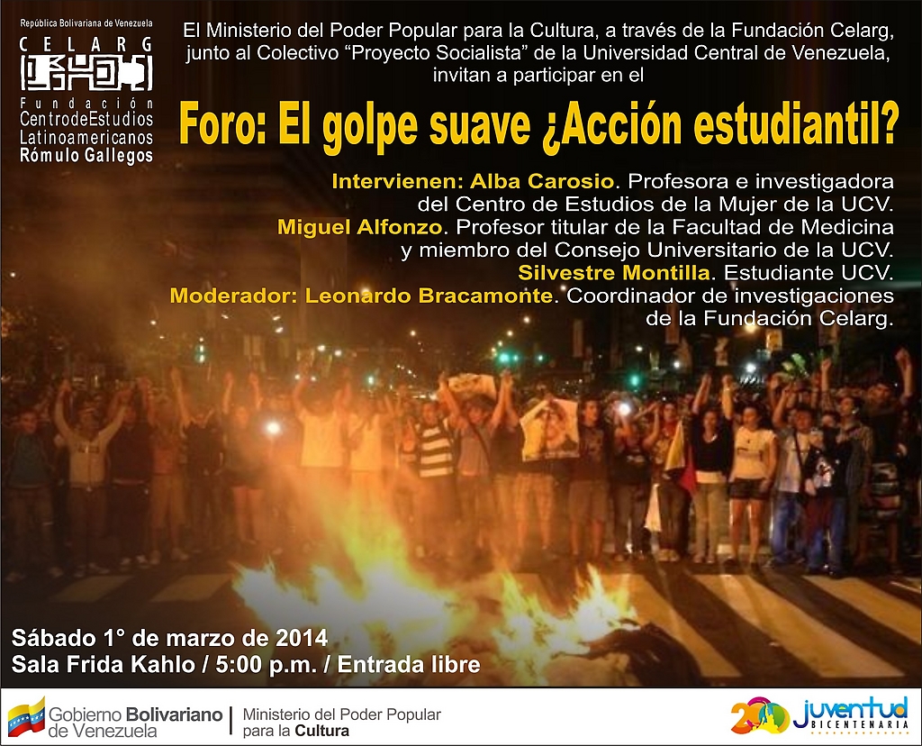 27 de febrero de 2014.- Los últimos 15 días hemos asistido a una movilización sostenida y violenta de grupos de jóvenes en el este de Caracas y de las principales ciudades del país que se definen como parte del “movimiento estudiantil”. Se supone que detrás de estas movilizaciones están inscritas una serie de reivindicaciones relacionadas con la “libertad” y el “futuro”. Sin embargo, estas exigencias, para ser cumplidas demandan “La Salida” del presidente constitucionalmente elegido, Nicolás Maduro. Este foro es una actividad que busca promover el debate sobre el Golpe Suave, que es lo que realmente se oculta detrás de estas manifestaciones de “estudiantes”, así como señalar el papel que la universidades autónomas y sus respectivas autoridades tienen en este contexto.