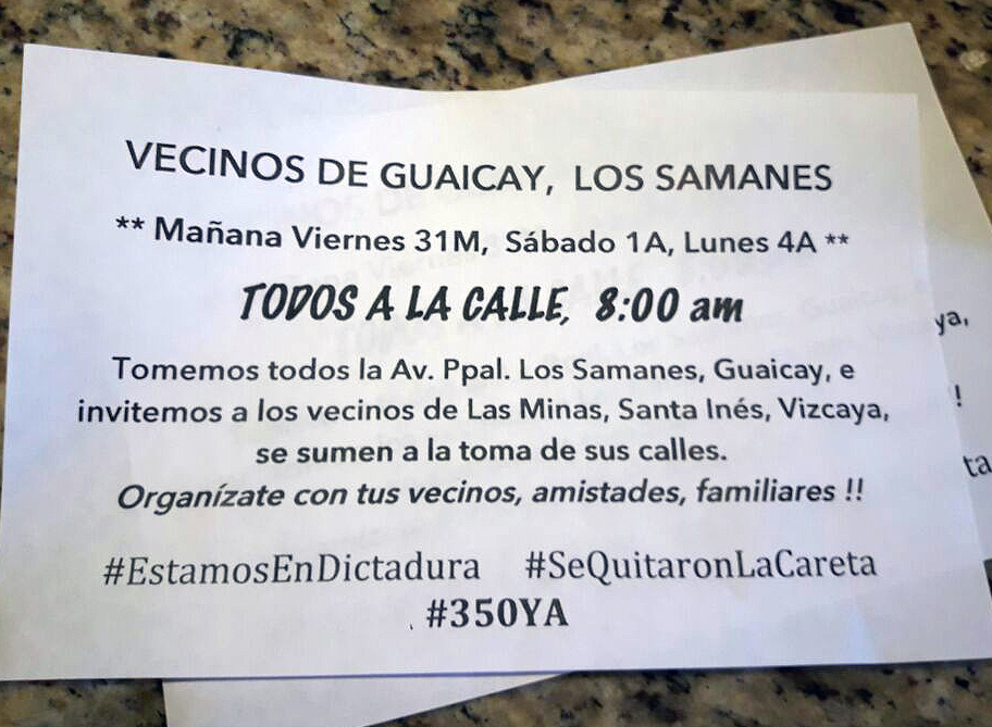 31/03/2017.- Una vez mas lo mejor que saben hacer los movimientos violentos de la oposición venezolana, están haciendo circular este tipo de volantes anónimos bajo el lema del pasado “Vecino Actívate!”. En el pasado reciente en el año 2014, los movimientos insurreccionales conocidos como guarimbas, dejaron numerosas familias enlutadas en toda la República, por lo que autoridades competentes deben estar prestas para salvaguardar a toda la ciudadanía ajena a estos nuevos ensayos violentos, que solo buscan crear más caos y zozobra sobre la población venezolana.