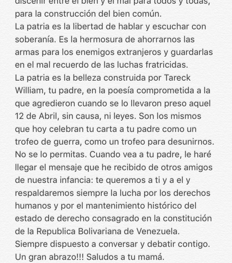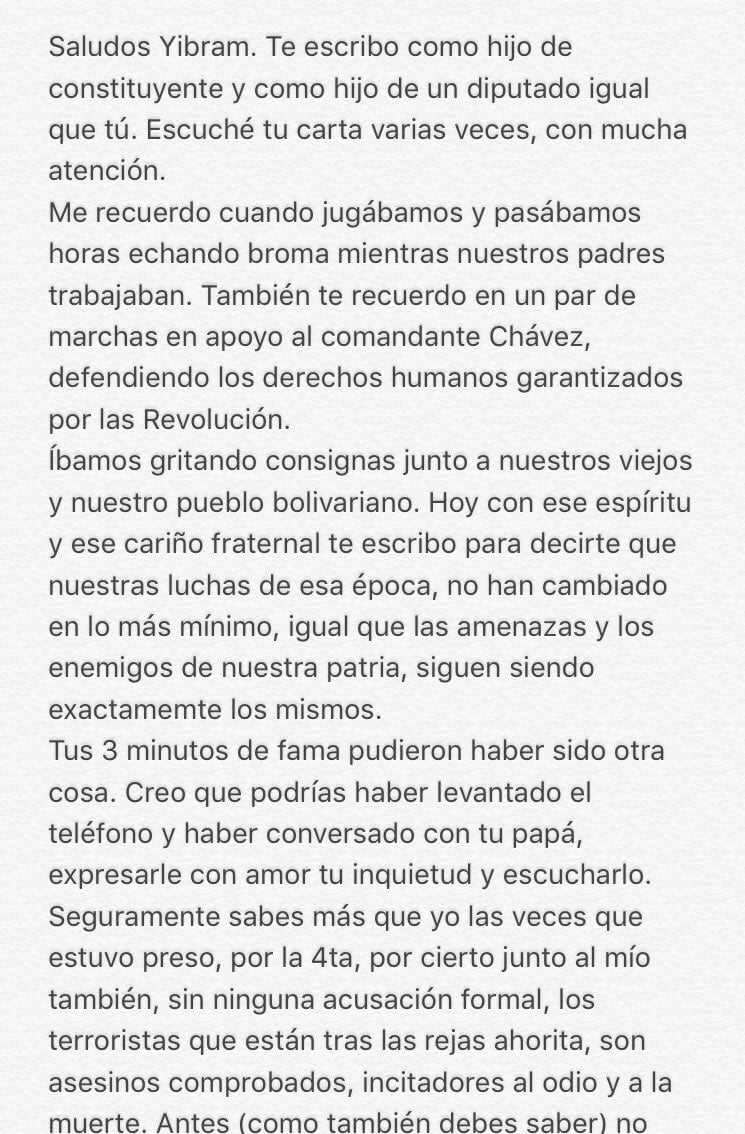 Caracas, abril 27 - El hijo del presidente de la República, Nicolás Maduro Guerra, envió una carta este miércoles en respuesta al mensaje que horas antes hizo llegar Yibram Saab, hijo del Defensor del Pueblo, a los venezolanos y a su padre para pedir el "cese de la represión" y confirmar su participación en la protesta opositora de este 26 de abril.( Ver https://www.aporrea.org/ddhh/n307606.html )