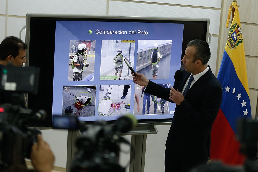 Durante la exposición de las imágenes, el Vicepresidente muestra unas imágenes en las que Neomar sale con un peto que tenía escrito “Yo soy Libertador”, pero al momento del hecho no lo portaba.