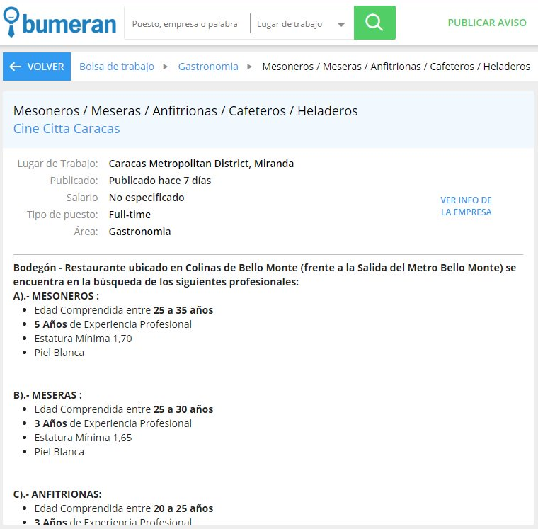 Caracas, 12 de junio de 2017.- El pasado 5 de junio de 2017 (en pleno siglo XXI), el estaurante Cine Cittá Caracas publicó una oferta laboral en internet que ha desatado la polémica por presentar un elemento discriminatorio y racista. La oferta incluía entre sus requisitos para trabajar como mesonero, mesera o anfitriona, que la persona debía ser de "piel blanca". La indignación generada por esta característica desató este martes una ola de críticas y reclamos de usuarios de las distintas redes sociales.