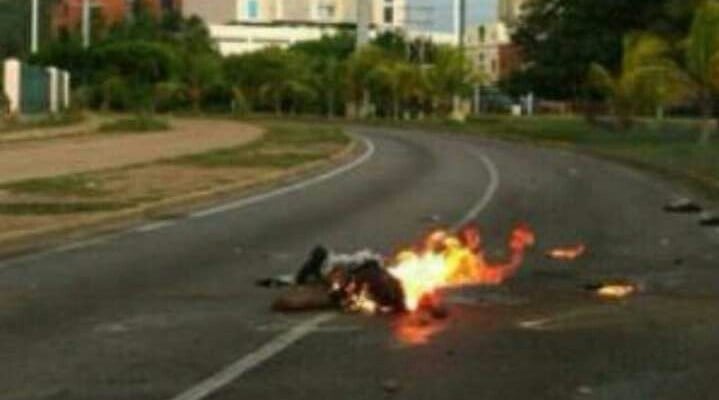 Caracas, julio 18 - Un hombre que se movilizaba en una moto por la avenida Daniel Camejo Octavio de Lechería, estado Anzoátegui, fue atacado por integrantes de un grupo de choque de la MUD que disparó un explosivo artesanal o mortero y luego lo apedrearon y quemaron.