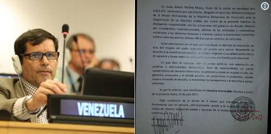 Medina anunció su renuncia al puesto un día antes de que visite la ONU el canciller venezolano, Samuel Moncada, para reunirse con el secretario general de Naciones Unidas, António Guterres.