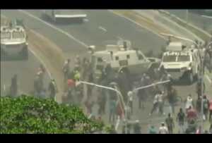 30-04-19.-Una tanqueta de la GNB arrolló este martes a varios de los manifestantes que se encontraban en la autopista Francisco Fajardo frente a la base La Carlota para asistir a la convocatoria hecha por Leopoldo López y Juan Guaidó en compañía de varios militares que se habrían sublevado, reseñaron usuarios a través de la red social Twitter.