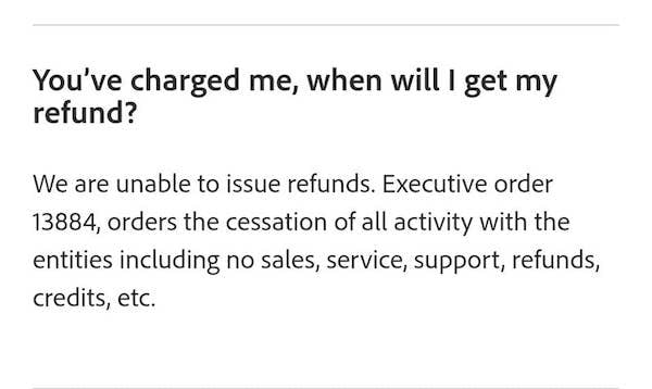 A raíz de esta decisión unilateral que afecta a miles de venezolanos, muchos de los clientes han pedido la devolución del dinero invertido bajo contrato con Adobe.com. sin embargo la compañía responde que debido a esta Orden Eejcutiva de Trump, 13884, no habrá servicio, asesorías, créditos ni reembolsos o devoluciones.