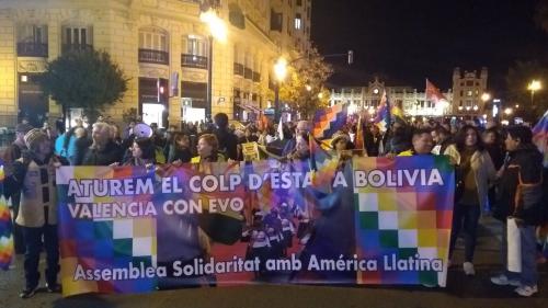 Las manifestaciones de solidaridad con el pueblo boliviano tienen lugar en Buenos Aires, Sao Paulo, Caracas, Ciudad de México, Nueva York o Barcelona. En Valencia, cerca de mil personas recorrieron el 19 de noviembre el centro de la ciudad, convocadas por 47 organizaciones sociales, partidos políticos, plataformas y sindicatos bajo el lema No al golpe de Estado en Bolivia. En la protesta, que comenzó en la sede del consulado de Bolivia, participó la comunidad boliviana del Movimiento Al Socialismo (MAS-IPSP) en Valencia. Además de mostrar banderas Wiphala (indígena), de Bolivia con crespón negro o comunistas, se expresaron consignas como "Evo amigo el pueblo está contigo", "Fuera los yankis de Bolivia", "Es un golpe, no es democracia", "No pasarán" o "La Wiphala se respeta, carajo". Las organizaciones condenaron en un comunicado el golpe de Estado "flagrante y servil orquestado por Estados Unidos, la UE y (…) la OEA ‘actuando como ‘Ministerio de las colonias gringas’; y ejecutado por la oligarquía de Bolivia, aquellos que una vez más han perdido en las urnas".