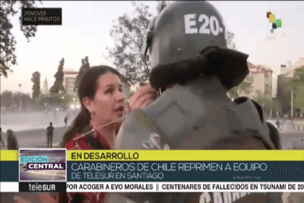 "A esta hora nuestra corresponsal Paola Dragnic es asediada por carabineros de Chile. La presionan para que no pueda informar. Estamos en vivo. Sigue con @teleSURtv", denunció la presidenta del canal internacional Patricia Villegas.