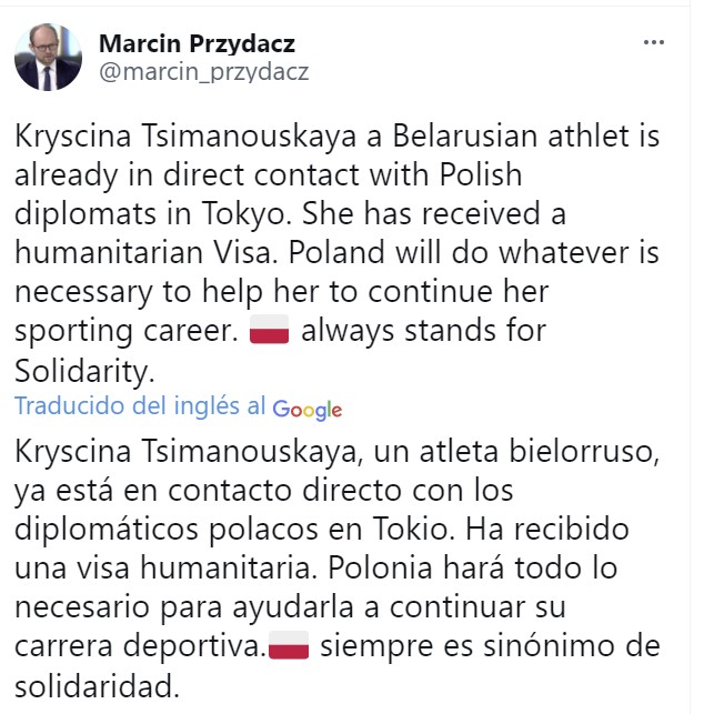 «Krystina Tsimanouskaya, una atleta bielorrusa, ya está en contacto directo con los diplomáticos polacos en Tokio; ha recibido una visa humanitaria», publicó en sus redes sociales Przydacz, pocas horas después de utilizar ese mismo medio para decir que «Polonia está preparada para ayudar» a la deportista.