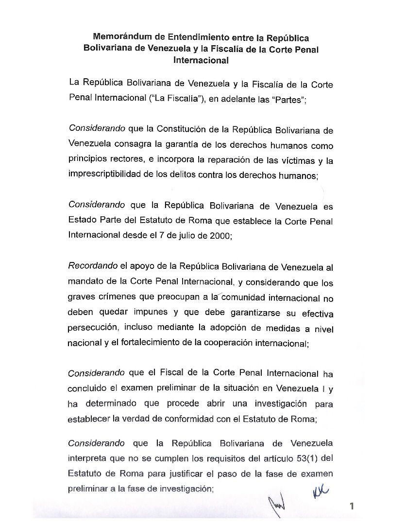El memorando de entendimiento fue suscrito más de dos meses después que la predecesora de Khan, Fatou Bensouda, concluyó en un documento que existe una "base razonable" para iniciar una investigación sobre presuntos crímenes de lesa humanidad cometidos en Venezuela.