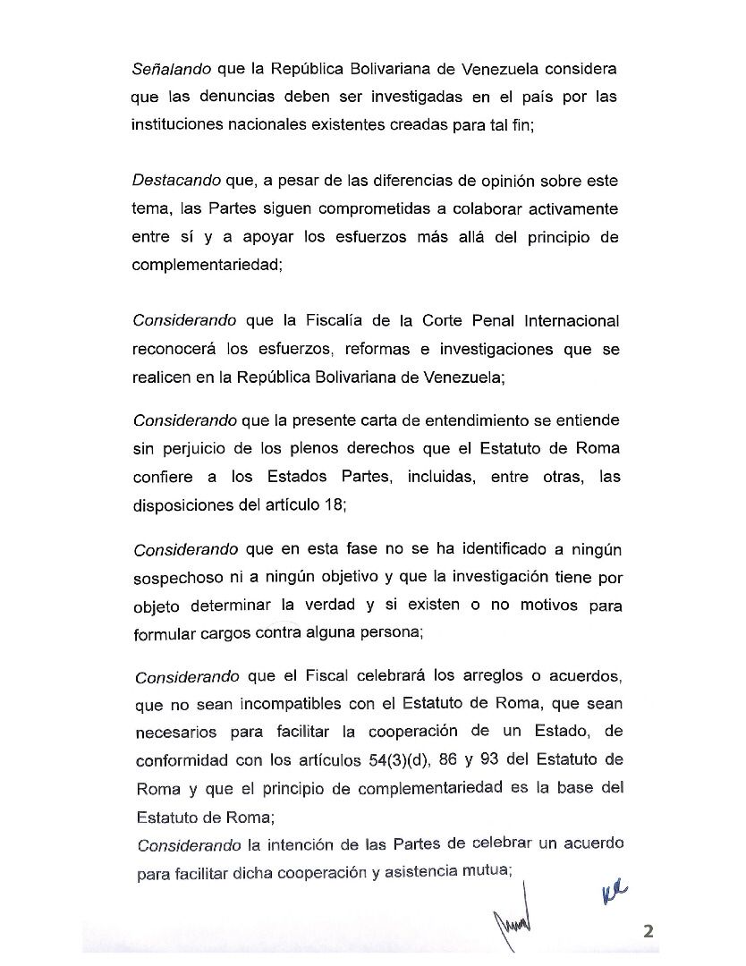 Venezuela ratificó su postura de que las denuncias deben "ser investigadas en el país por las institucionales nacionales" e "impartir justicia hasta las últimas consecuencias". Destacó además que las partes siguen comprometidas a colaborar activamente entre sí y a apoyar los esfuerzos más allá del principio de complementariedad" sin perjuicio de los derechos que el estatuto de Roma confiere.