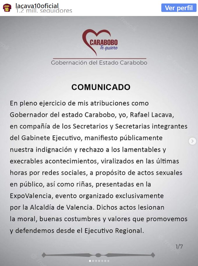 A través de un comunicado publicado en su cuenta en Instagram, el mandatario regional aseguró que la organización de ese evento es responsabilidad directa y única de la Alcaldía de Valencia.