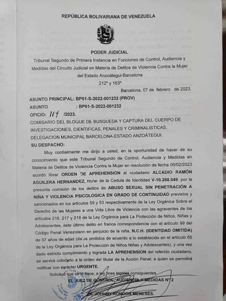 14-02-23.-Un tribunal del estado Anzoátegui dictó orden de captura contra Alcadio Ramón Aguilera Hernández, presidente de la Cruz Roja en esa entidad, por la presunta comisión de los delitos de abusos sexual sin penetración a una niña de 7 años y violencia psicológica en grado de continuidad.
