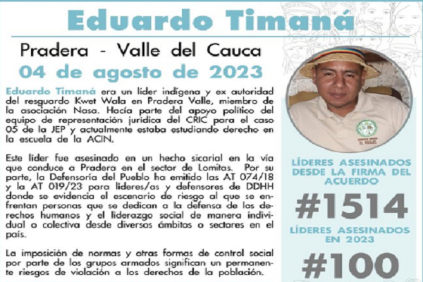 Al menos 100 líderes sociales han sido asesinados en Colombia, al confirmarse el viernes el asesinato del líder social e indígena, Luis Eduardo Timana, en el municipio Pradera del departamento del Valle del Cauca.
