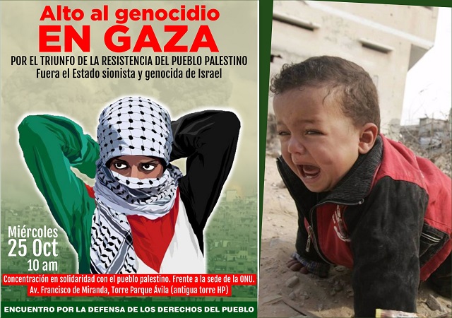 El espacio unitario que congrega a la izquierda crítica en Venezuela, agrupada en el Encuentro por la Defensa de los Derechos del pueblo, está convocando de manera amplia para el día miércoles 25 de octubre a las 10 am, a una concentración de solidaridad con el pueblo palestino, frente a la sede de la ONU en la Av Francisco de Miranda, en Caracas (cerca de la estación Miranda del metro).