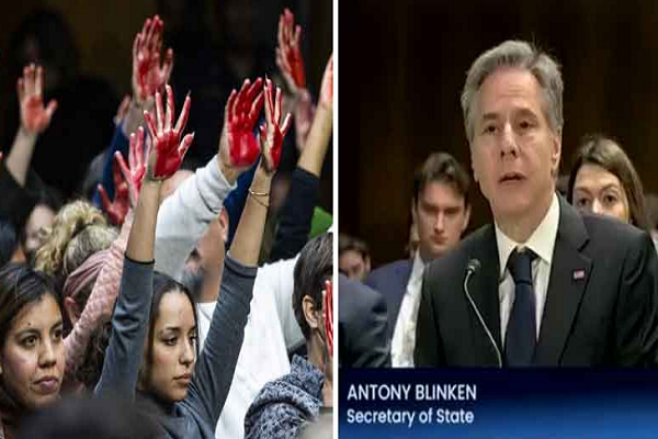 A Blinken se le hizo casi imposible hablar cuando los participantes en la protesta -que fueron sacados por la Policía del Capitolio-comenzaron a levantarse uno a uno con pancartas y demandaban además el fin del financiamiento del Gobierno de Estados Unidos a Israel.