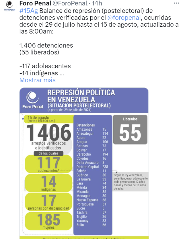 16-08-24.-La ONG Foro Penal confirmó este jueves que de los más de 1.400 detenidos en el marco de las protestas poselectorales, el Estado solo ha liberado a unas 55 personas.